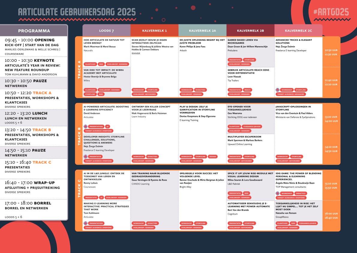 Laat je verrassen door interactieve workshops en boeiende presentaties die je nieuwe inzichten geven. Je ontmoet de Articulate Heroes en ontdekt hoe zij het verschil maken.