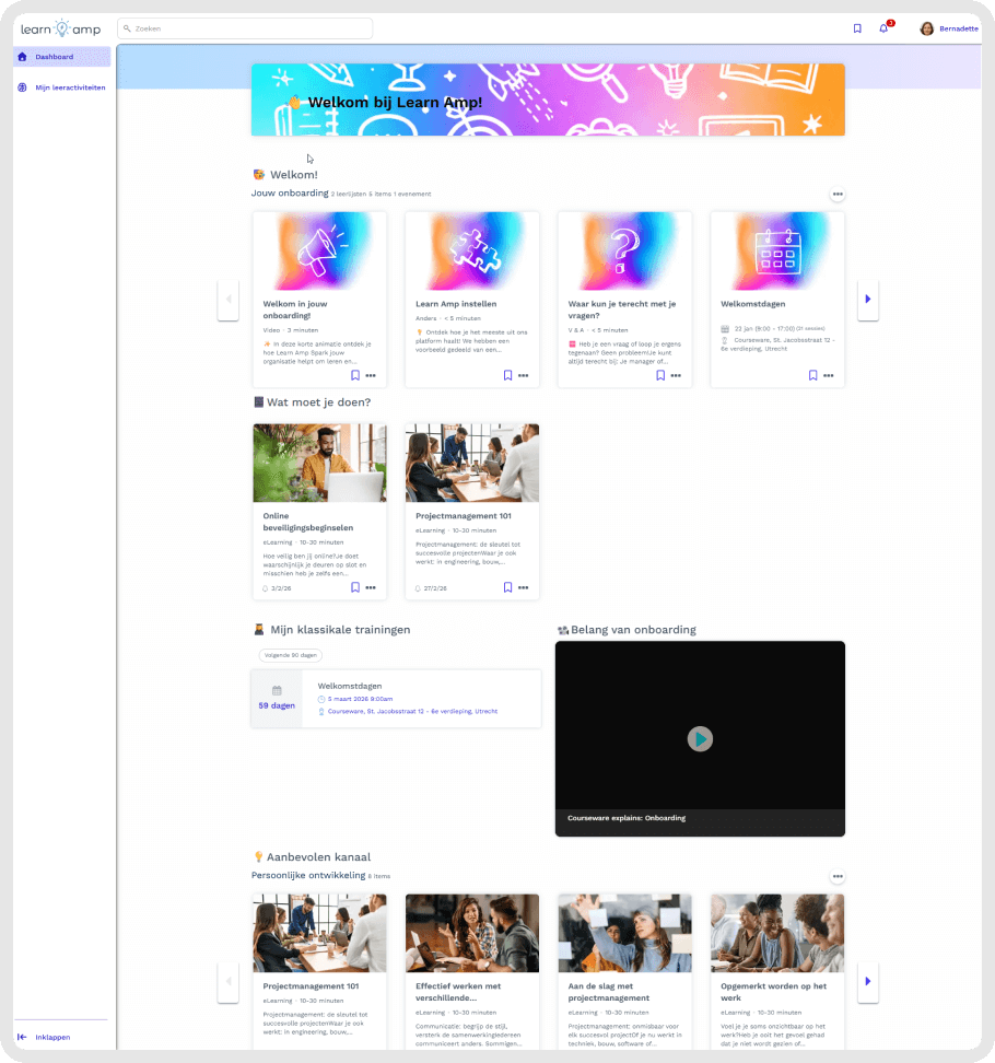 Eén plek voor je content, leerpaden, evenementen en voortgang. Makkelijk te beheren, prettig voor medewerkers om te gebruiken.
